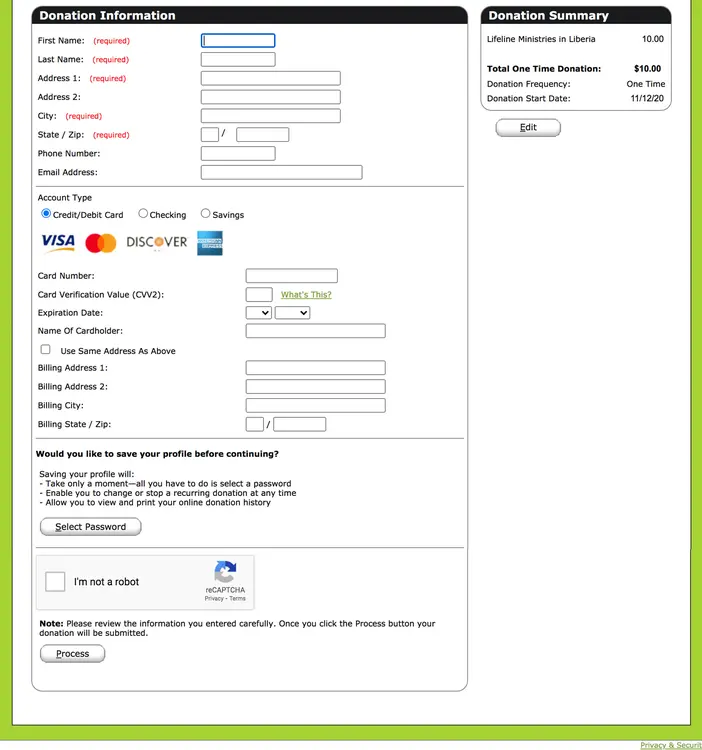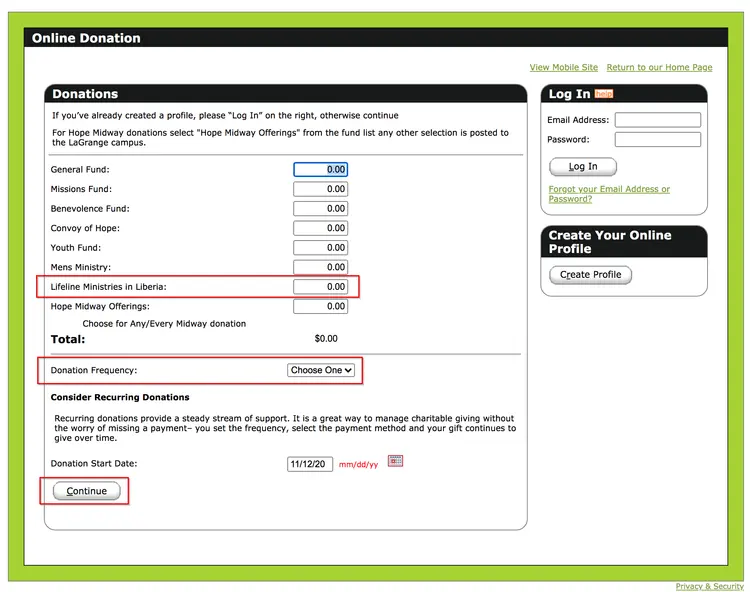 Fill in the amount in the space for Lifeline Ministries in Liberia, choose whether you would like to make a recurring or one time donation (and the starting date), and click on the 'continue' button.